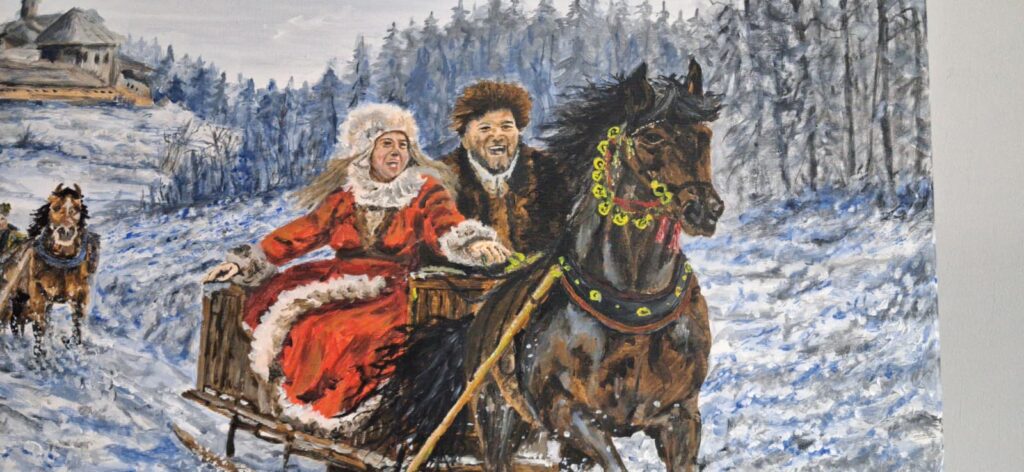 W tle pojawia się kolejny zaprzęg oraz zimowy krajobraz – lekko pagórkowaty teren, drzewa bez liści i zabudowania przypominające dawną architekturę. Całość tworzy opowieść osadzoną w tradycji, nawiązującą do dawnych zwyczajów i wspólnego spędzania czasu w zimowej scenerii.