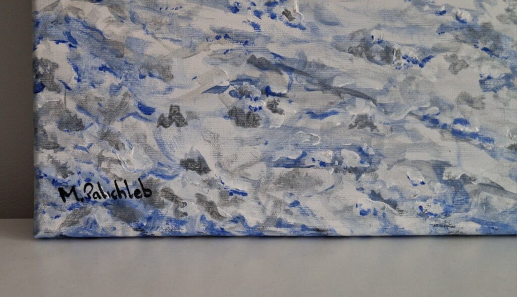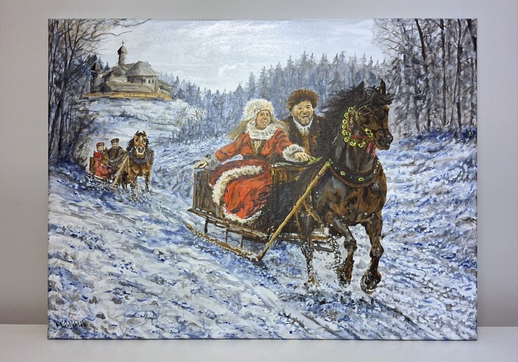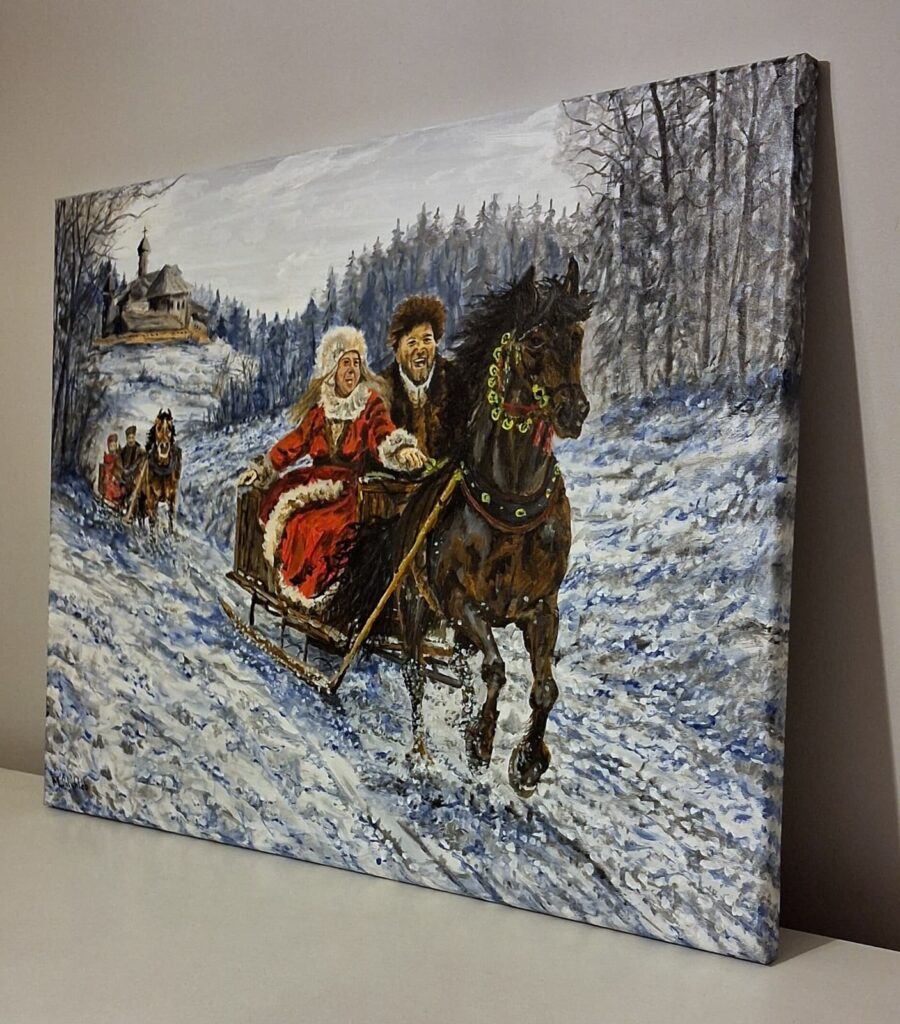 Obraz „Kulig” o wymiarach 80 × 60 cm został wykonany techniką akrylową na płótnie bawełnianym. Przedstawia dynamiczną scenę zimowej przejażdżki saniami zaprzężonymi w konie, ukazaną w ruchu, niemal w jednej uchwyconej chwili.