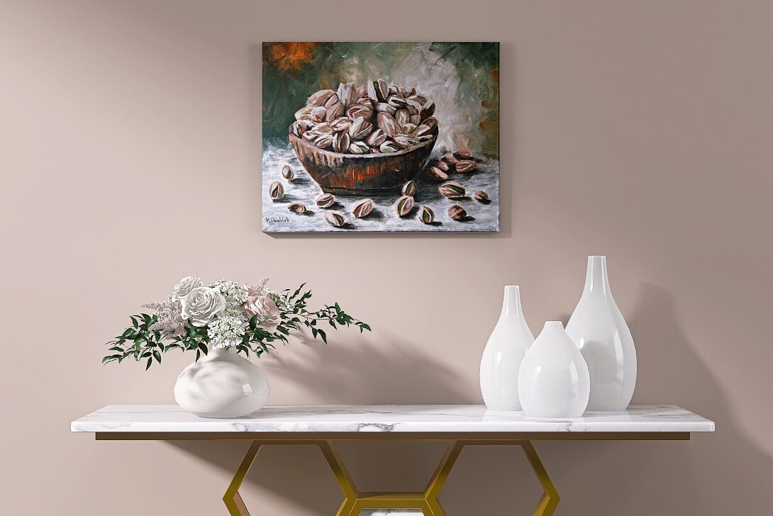 Martwa natura przedstawiająca miskę pełną pistacji, namalowana akrylami na płótnie. Artystyczne pociągnięcia pędzla nadają kompozycji teksturę i dynamikę, podkreślając grę światła i cienia. Ciepłe brązy miski kontrastują z subtelną zielenią orzechów oraz stonowanym tłem, co tworzy harmonijną i przyjemną dla oka kompozycję.