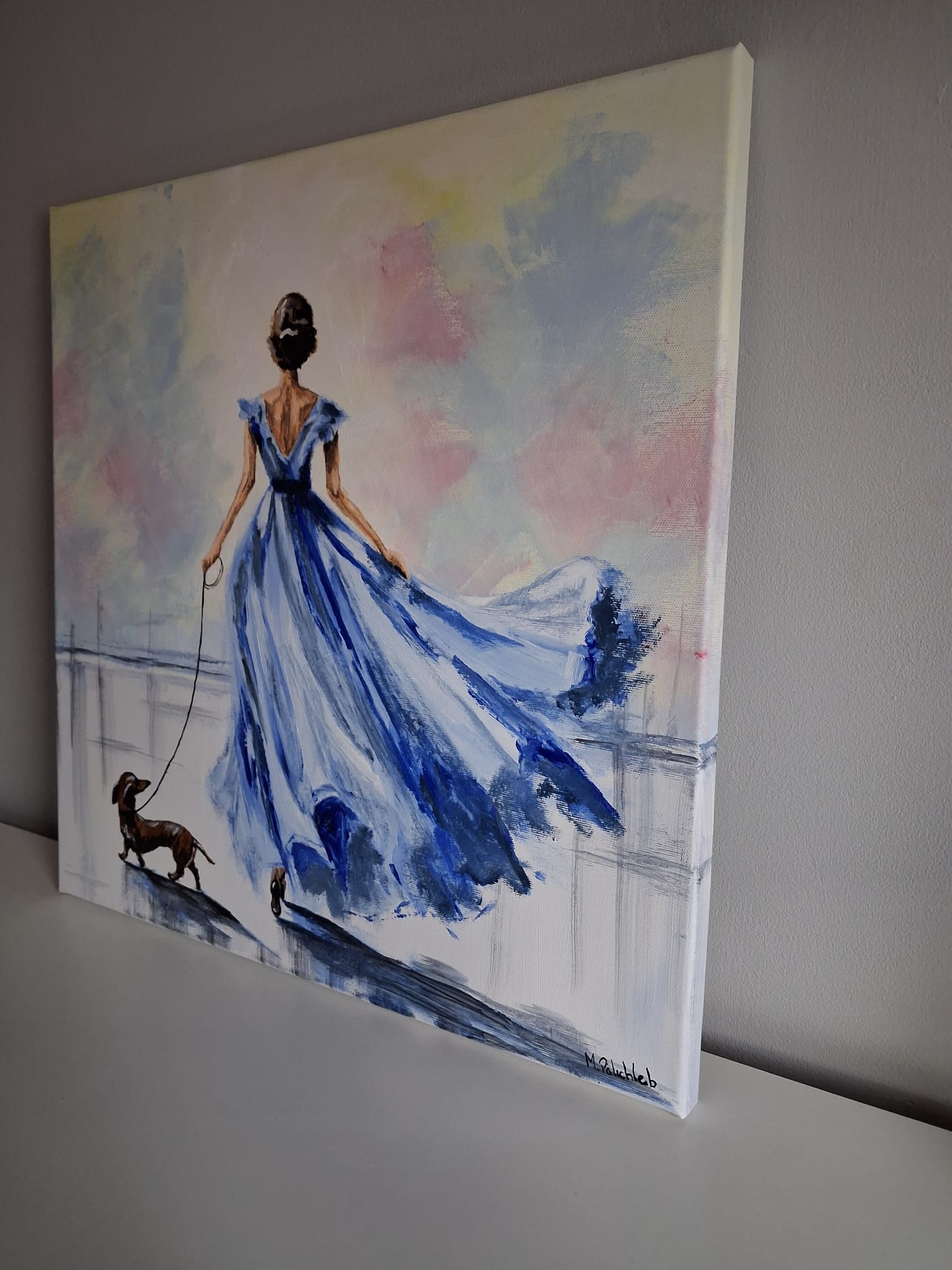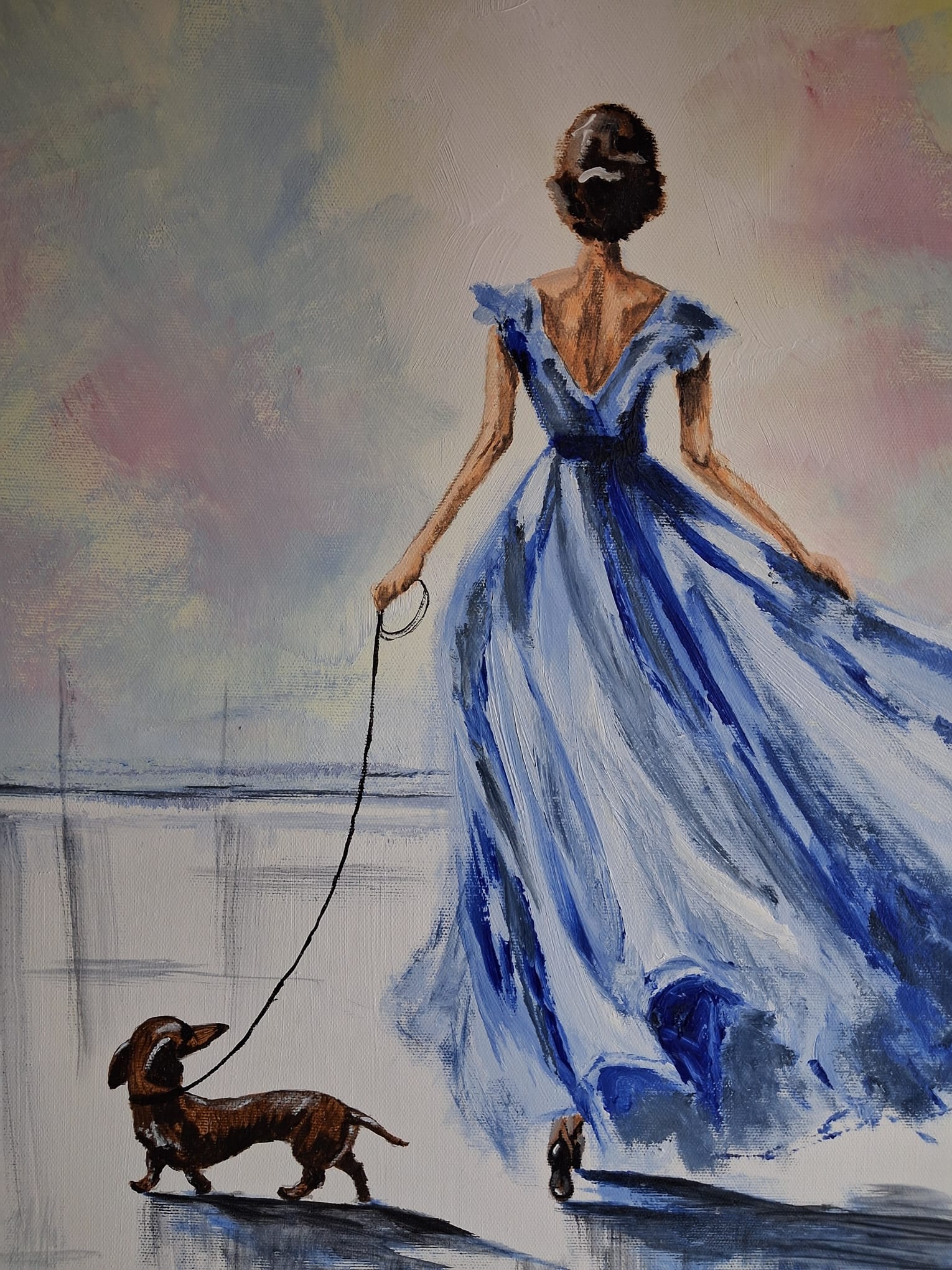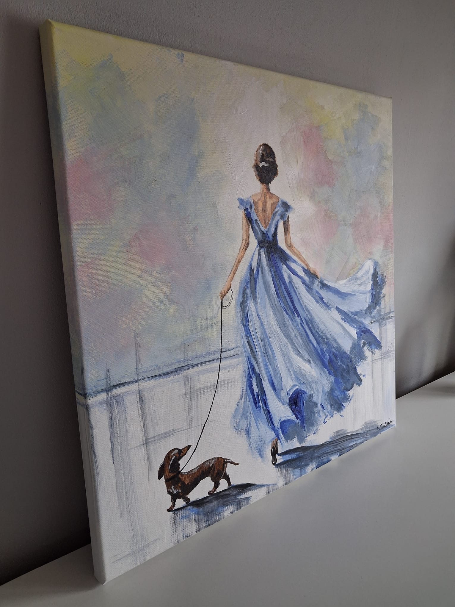 Subtelna kompozycja przedstawia kobietę w zwiewnej, błękitnej sukni spacerującą w towarzystwie jamnika. Delikatne, pastelowe tło podkreśla lekkość ruchu i elegancję sylwetki. Dynamiczne pociągnięcia pędzla nadają tkaninie wrażenie płynności i przestrzeni. Obraz emanuje spokojem, klasą i ponadczasowym wdziękiem.
