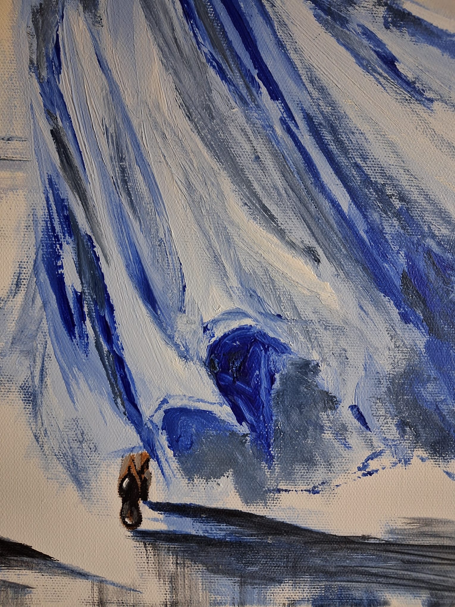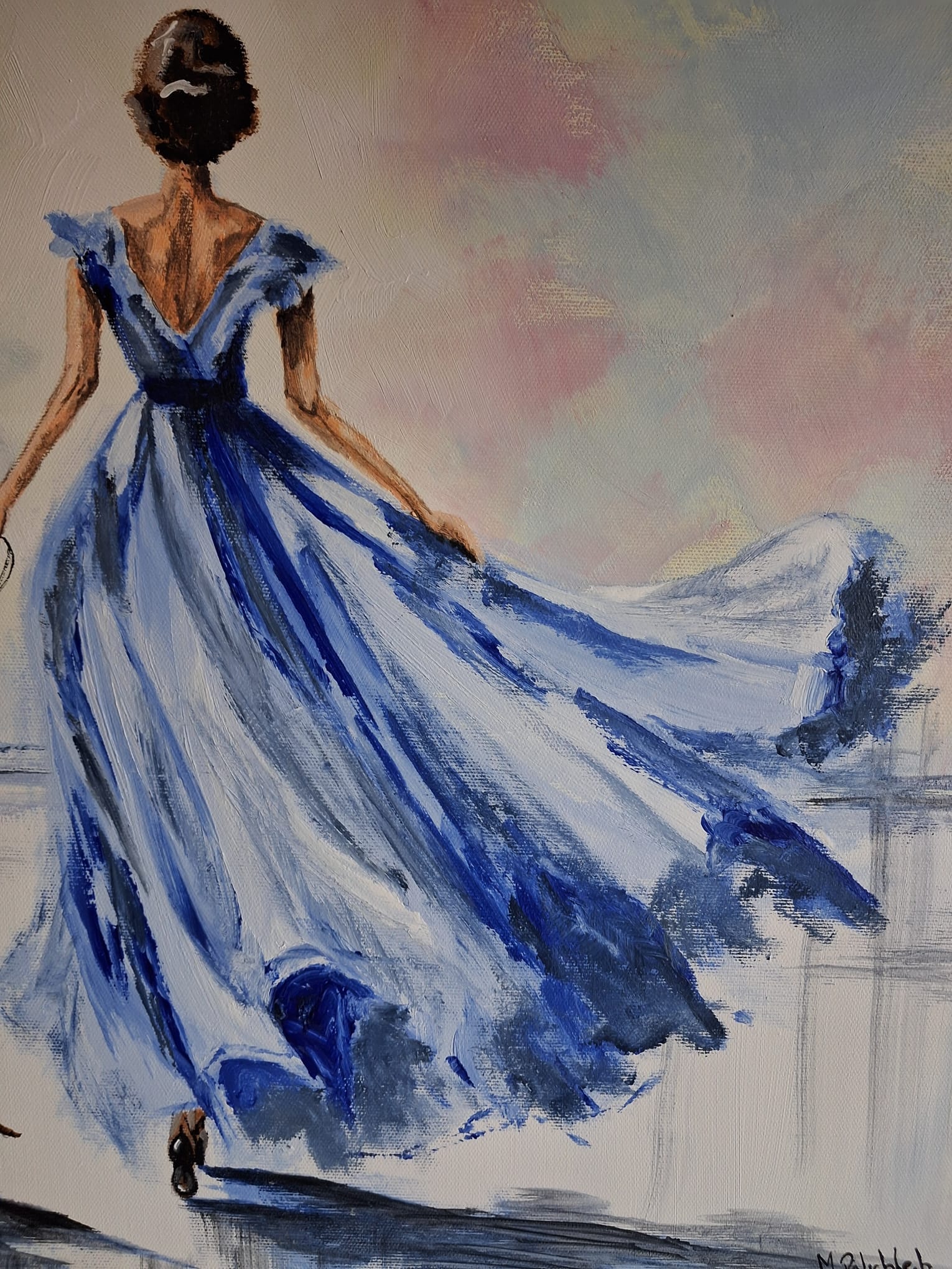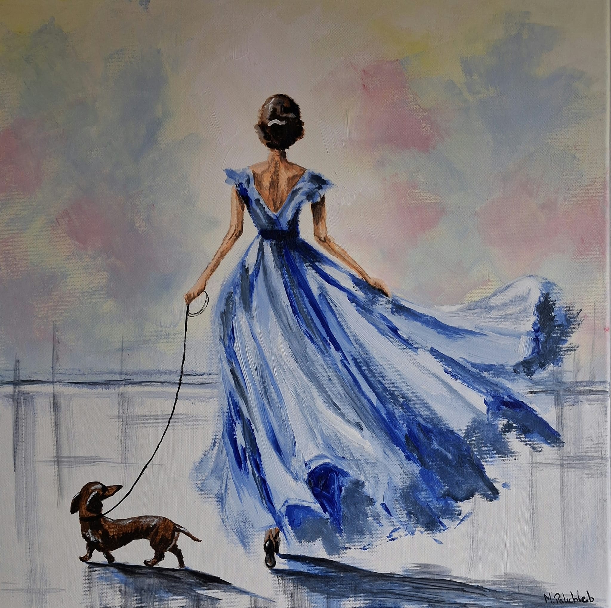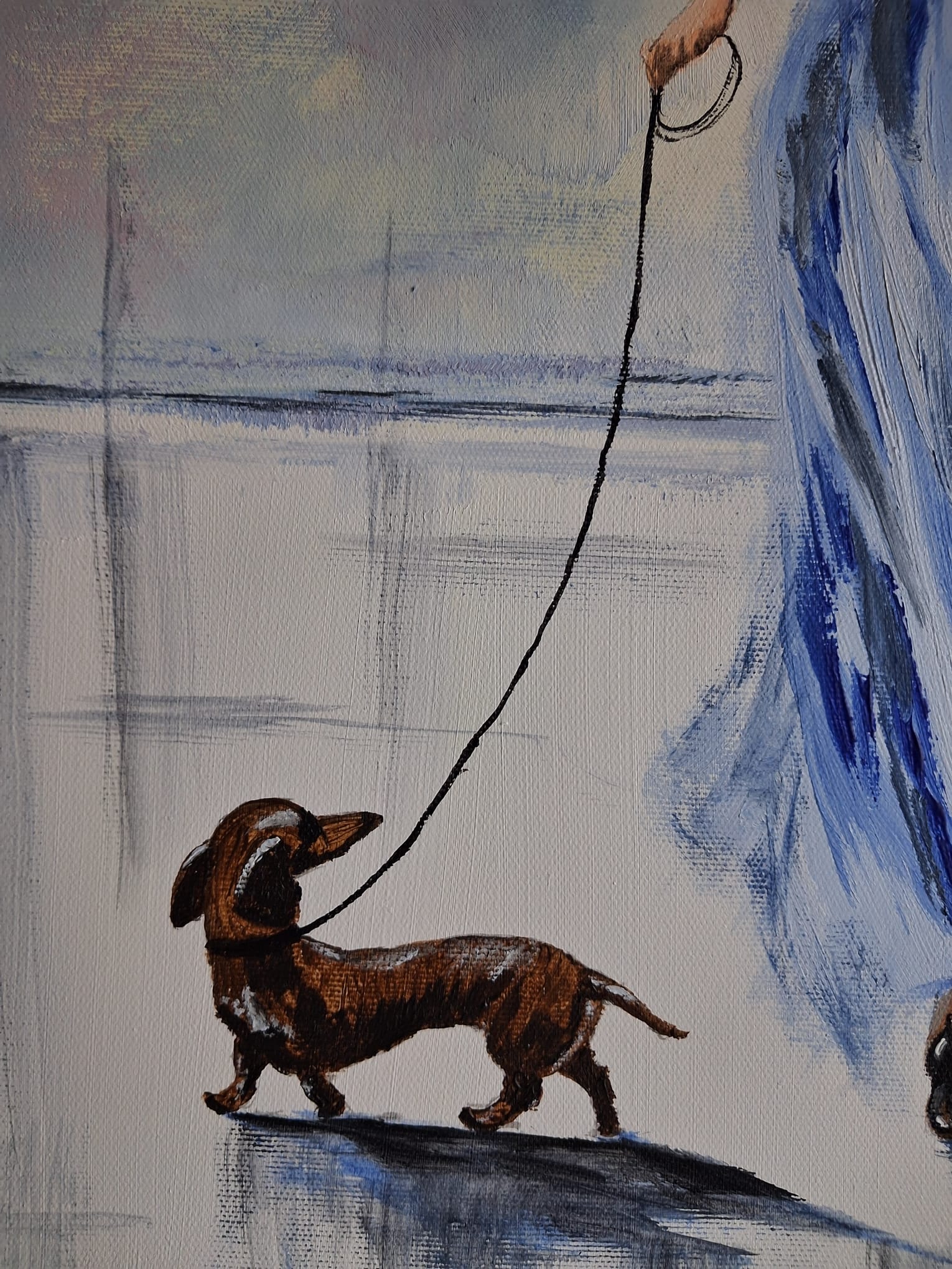 Subtelna kompozycja przedstawia kobietę w zwiewnej, błękitnej sukni spacerującą w towarzystwie jamnika. Delikatne, pastelowe tło podkreśla lekkość ruchu i elegancję sylwetki. Dynamiczne pociągnięcia pędzla nadają tkaninie wrażenie płynności i przestrzeni. Obraz emanuje spokojem, klasą i ponadczasowym wdziękiem.