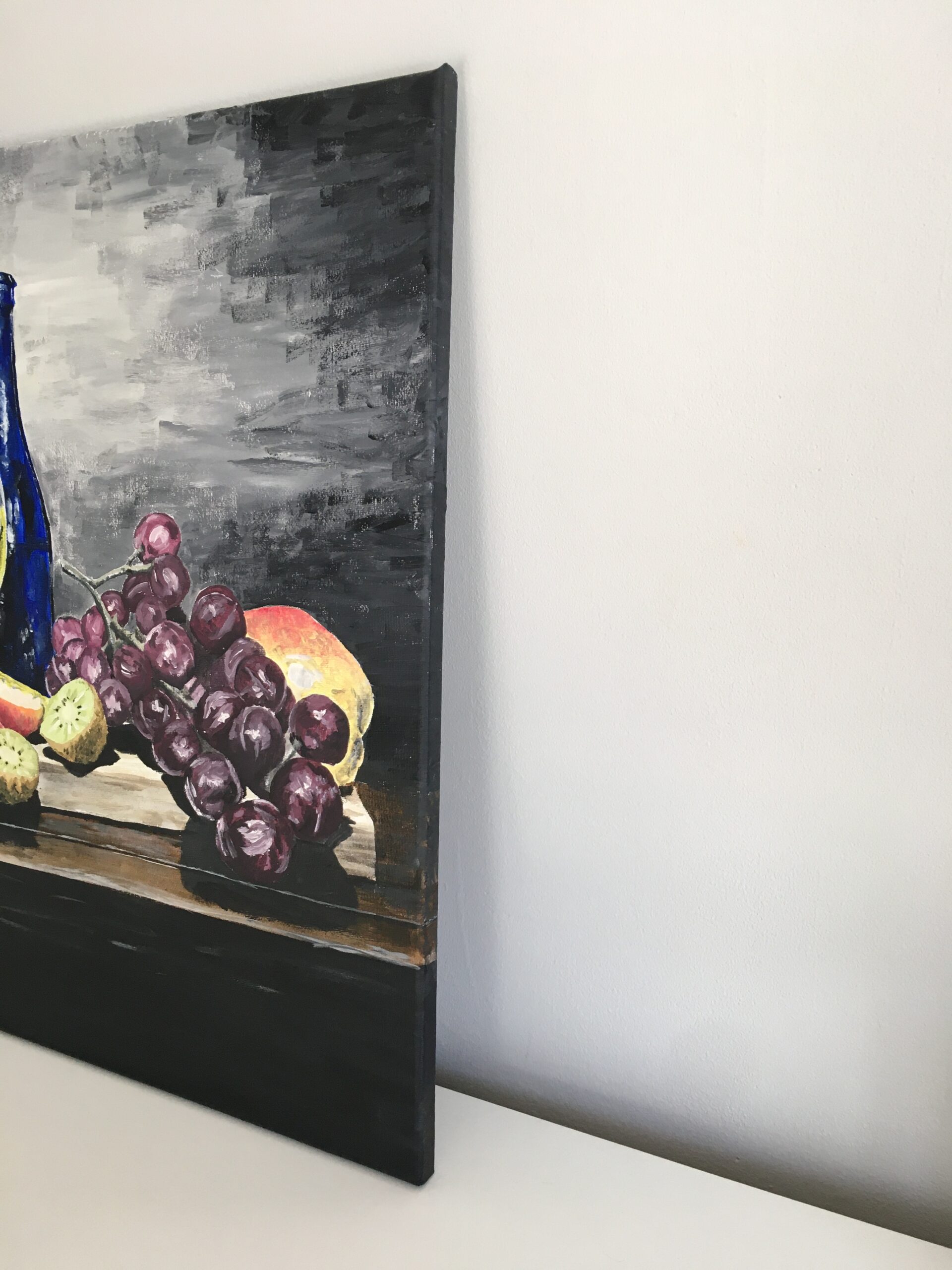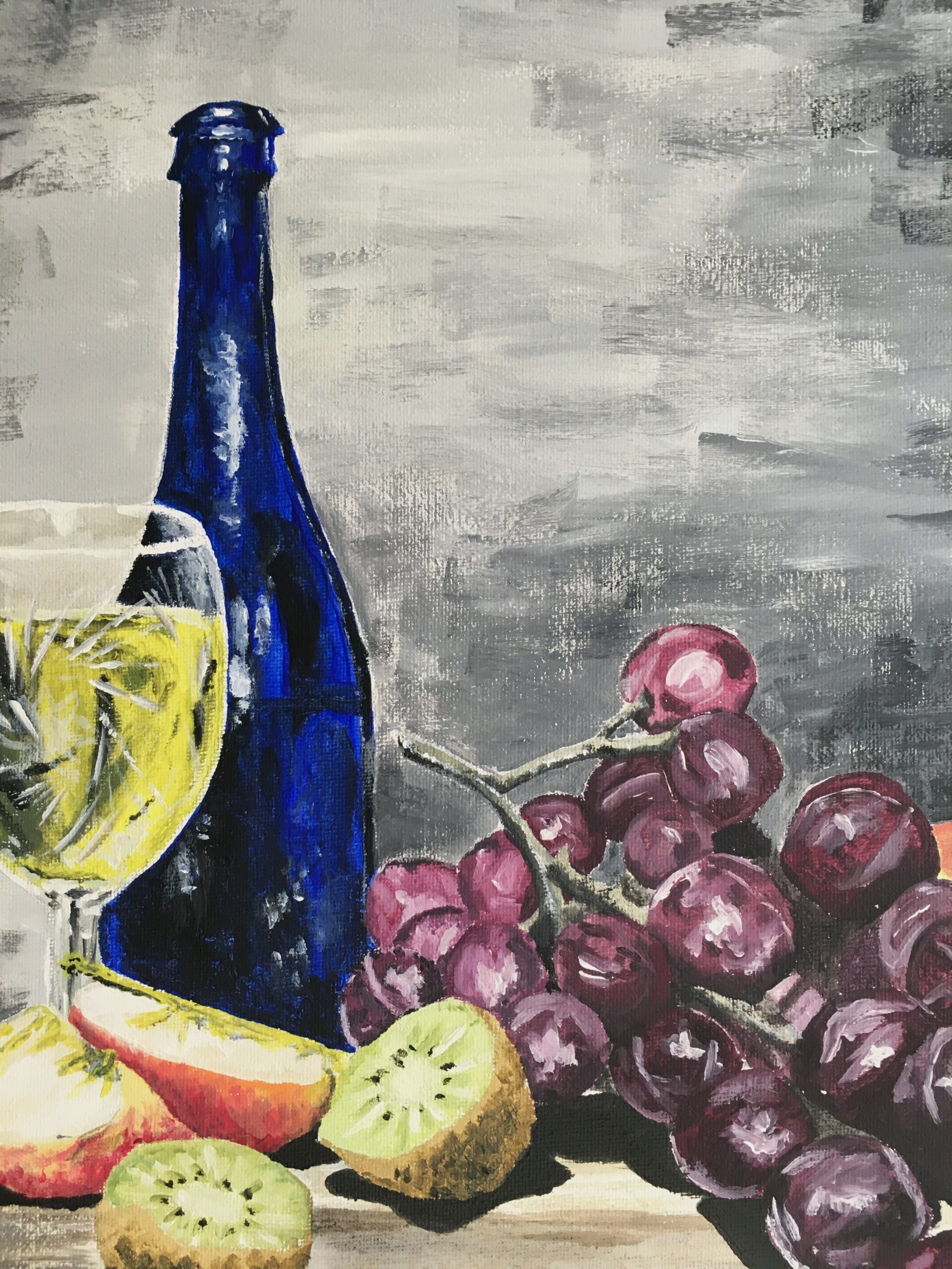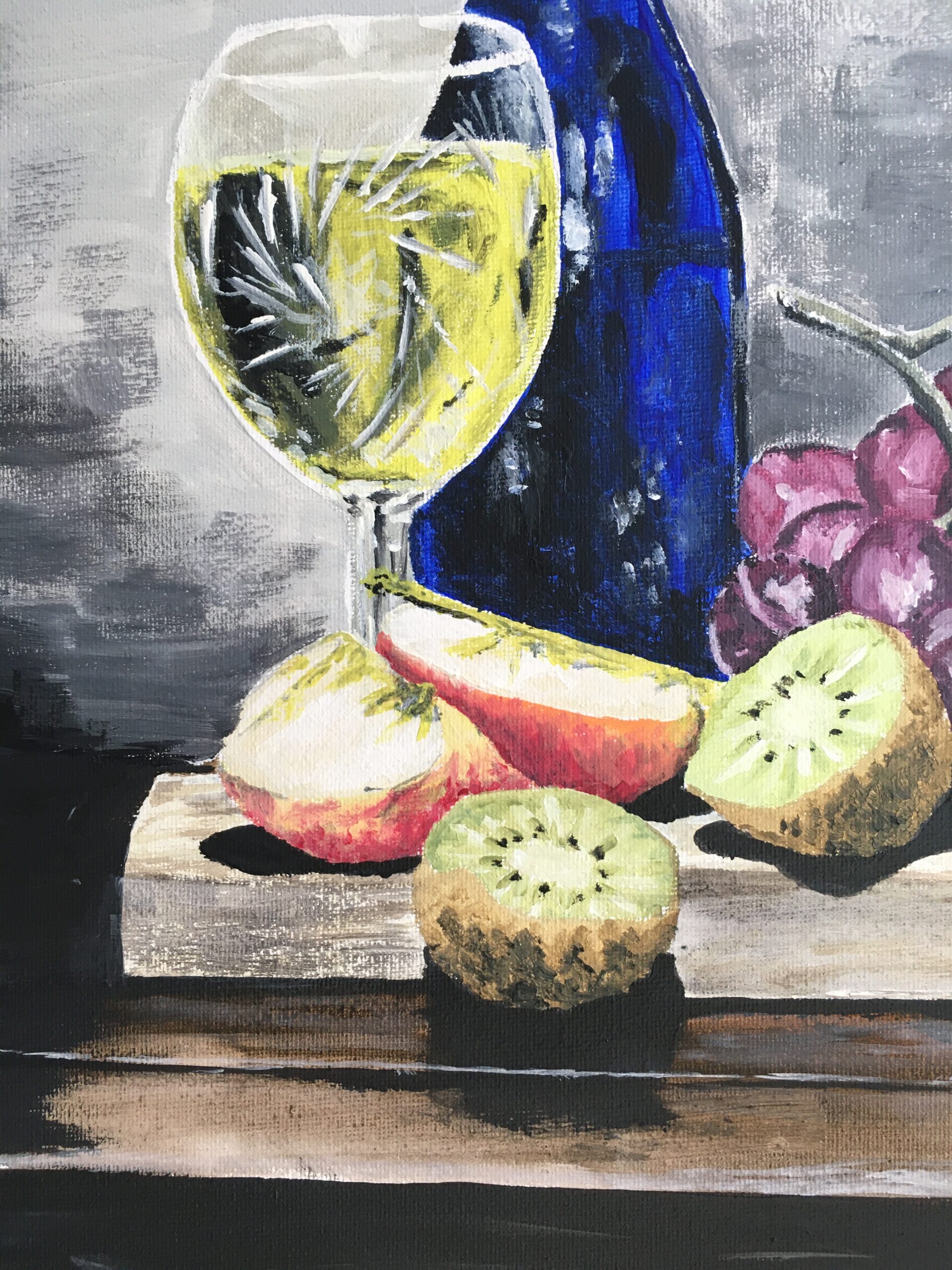 Martwa natura z winogronami, kieliszkiem białego wina i owocami, namalowana akrylami na płótnie. Głęboki kontrast między ciemnym tłem a intensywnymi barwami owoców i butelki dodaje kompozycji wyrazistości. Refleksy światła na szkle i winogronach podkreślają realizm.