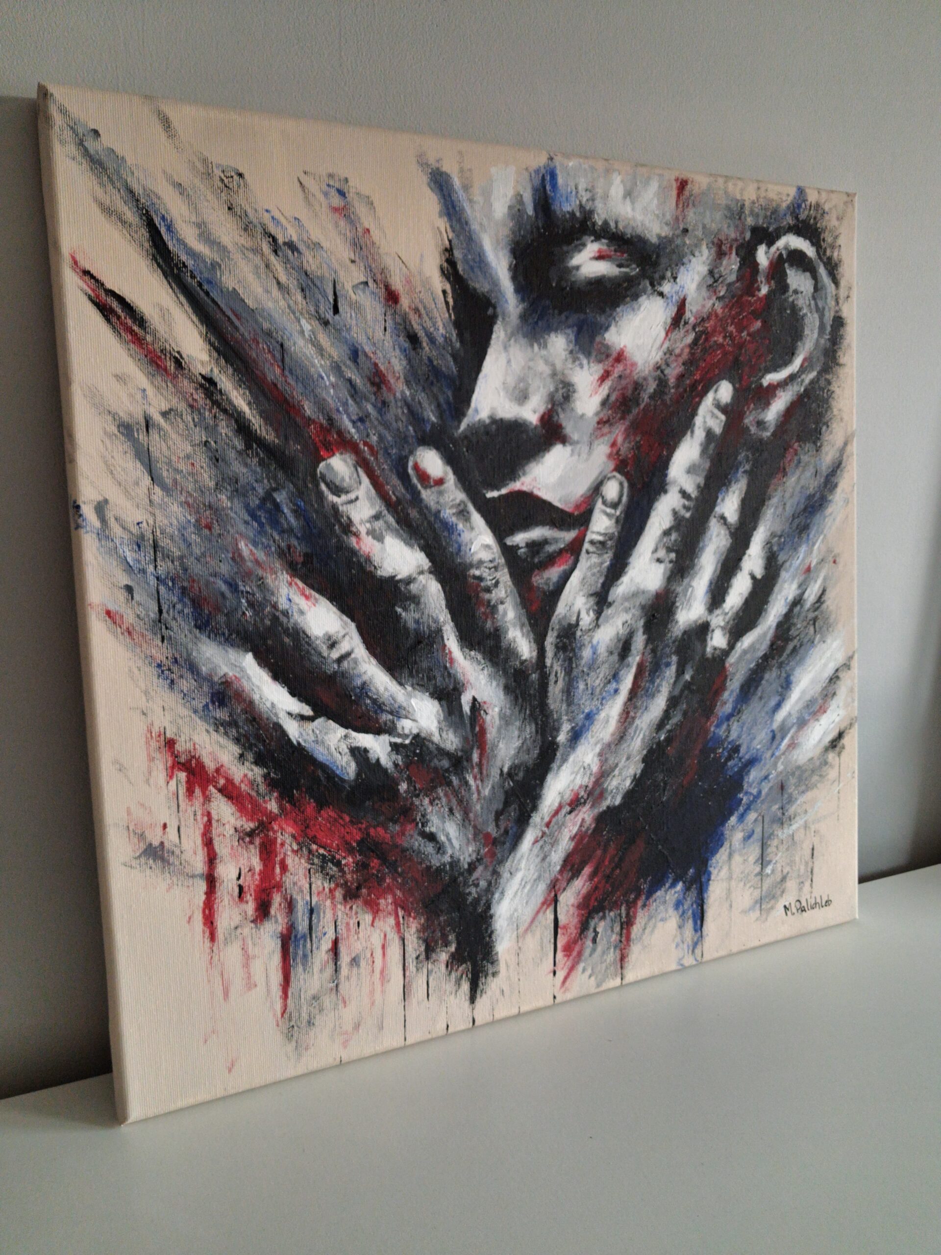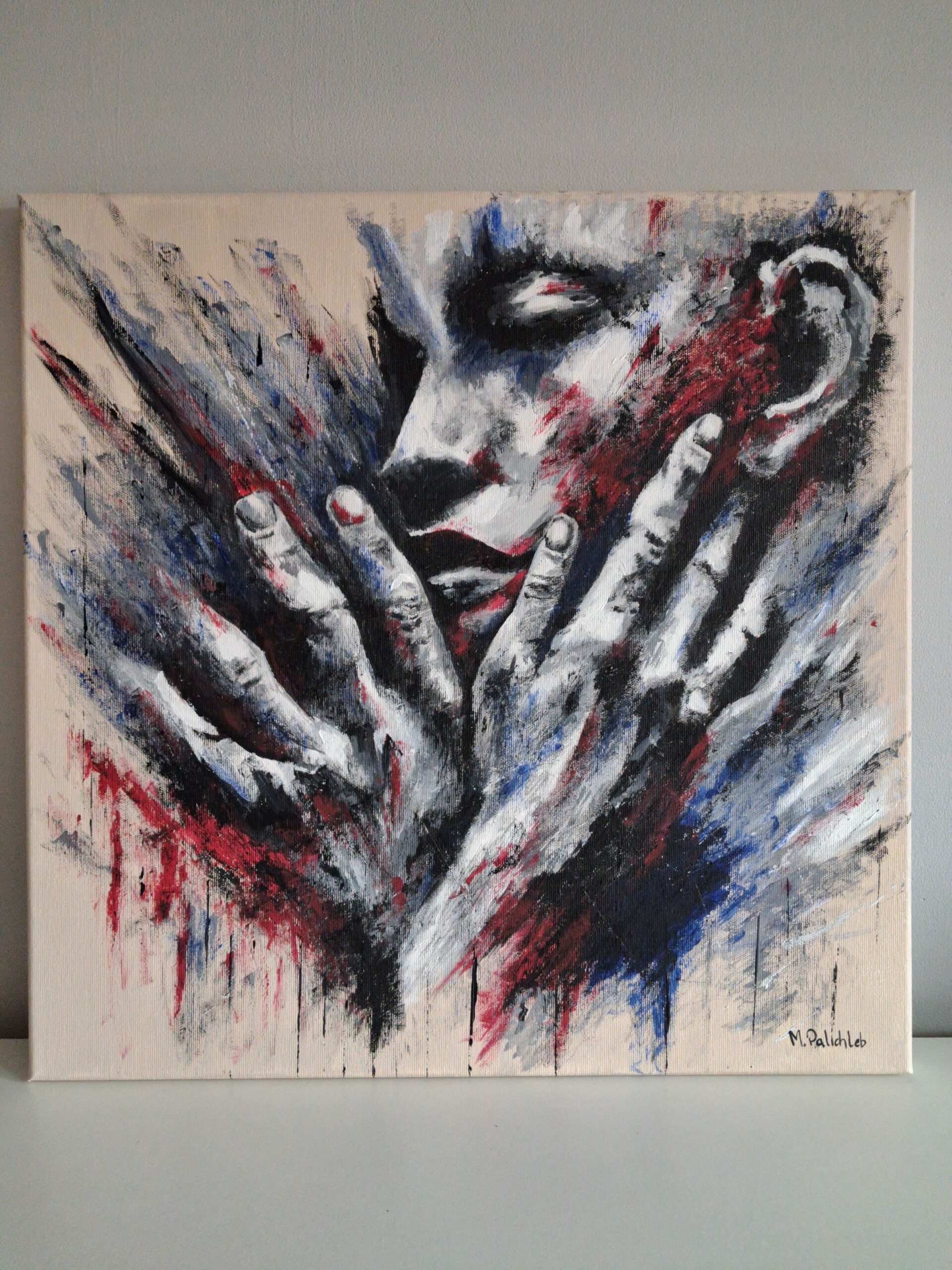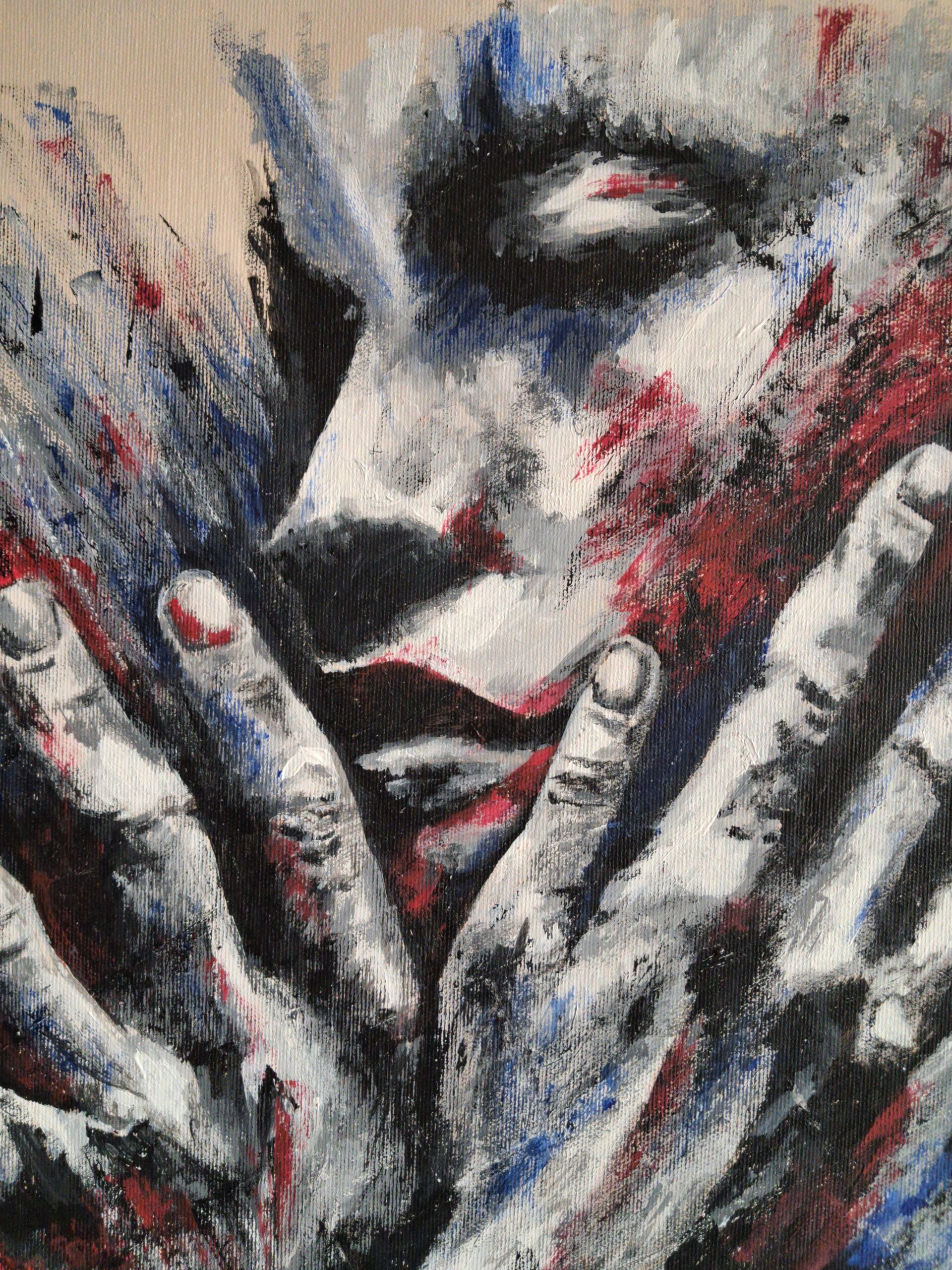 Ekspresyjny portret ukazuje twarz częściowo przesłoniętą dłońmi, oddaną dynamicznymi, zdecydowanymi pociągnięciami pędzla. Kontrast czerni, bieli i intensywnej czerwieni buduje silne napięcie emocjonalne. Surowa faktura akrylu podkreśla dramatyzm kompozycji i wewnętrzny niepokój. Obraz przyciąga uwagę i pozostawia przestrzeń do indywidualnej interpretacji.