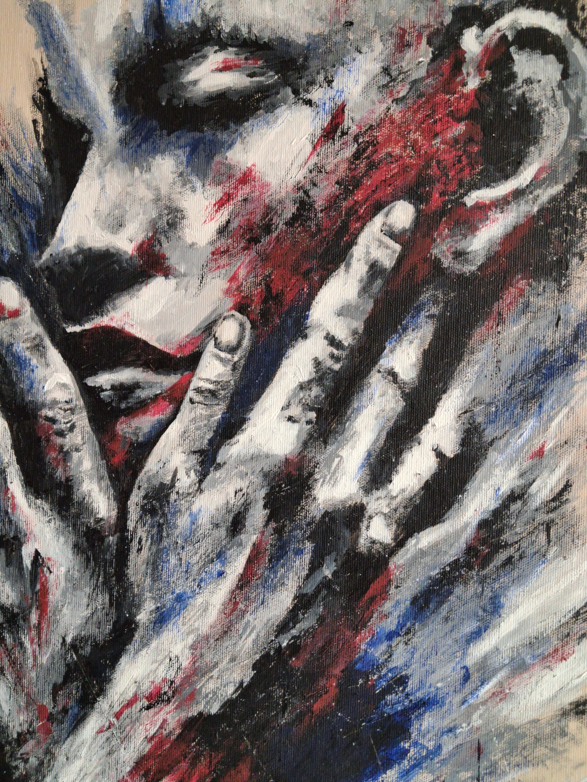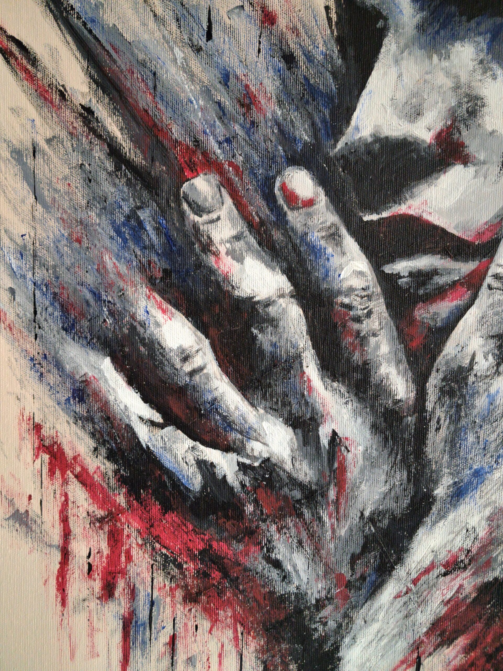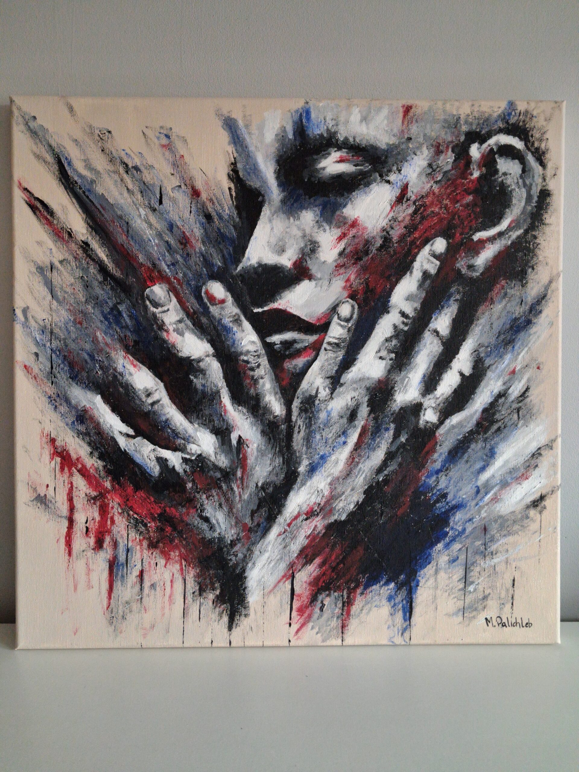 Ekspresyjny portret ukazuje twarz częściowo przesłoniętą dłońmi, oddaną dynamicznymi, zdecydowanymi pociągnięciami pędzla. Kontrast czerni, bieli i intensywnej czerwieni buduje silne napięcie emocjonalne. Surowa faktura akrylu podkreśla dramatyzm kompozycji i wewnętrzny niepokój. Obraz przyciąga uwagę i pozostawia przestrzeń do indywidualnej interpretacji.