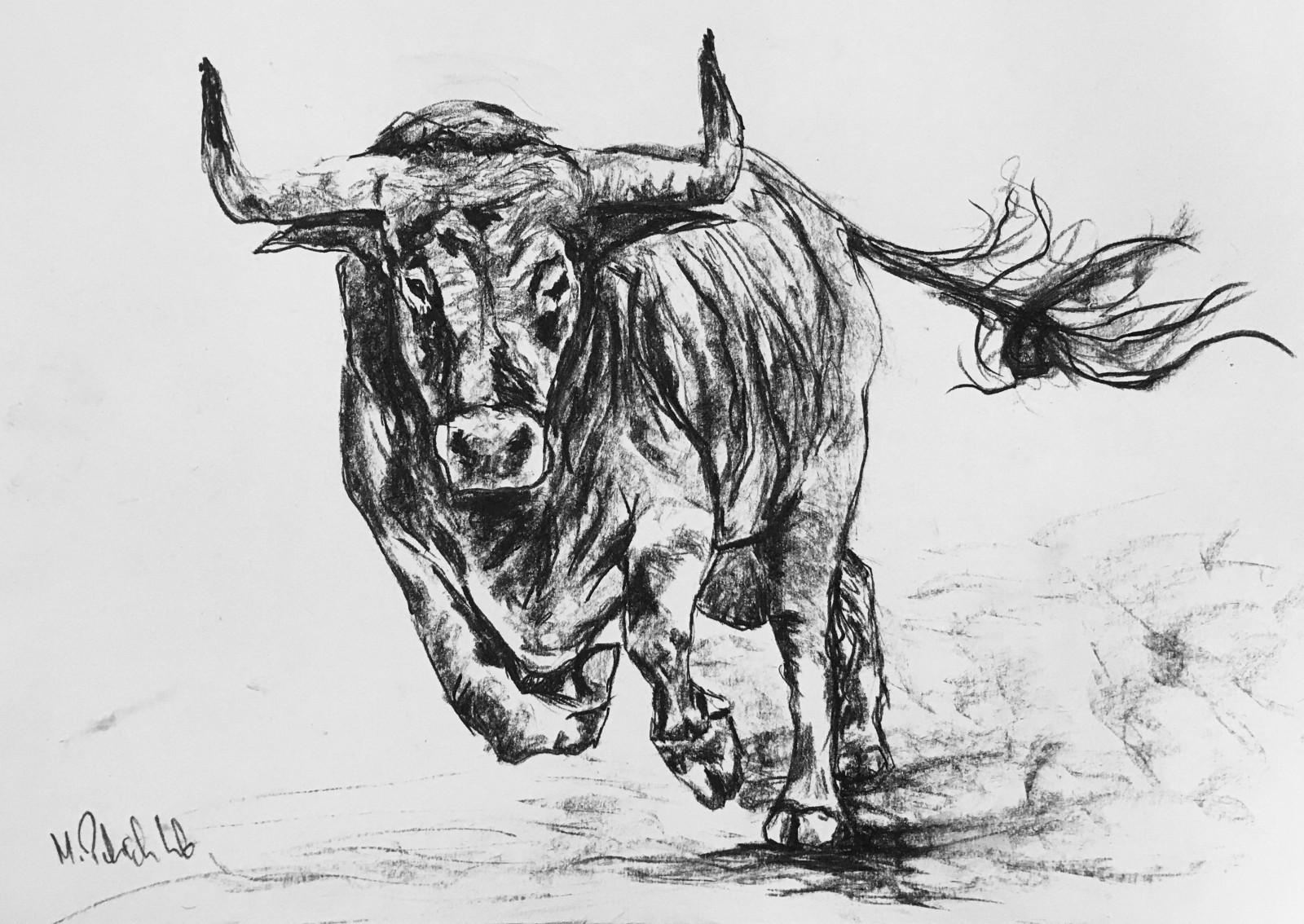 Potężny byk w dynamicznym pędzie, uchwycony z ekspresją i siłą za pomocą węgla. Mocne, wyraziste linie podkreślają muskularną sylwetkę zwierzęcia, a energiczne cieniowanie nadaje mu trójwymiarowości i ruchu. Rozwiana sierść ogona i twardo stąpające kopyta wzmagają poczucie dzikiej mocy i determinacji. Kontrast czerni i bieli wzmacnia dramatyzm kompozycji, czyniąc rysunek pełnym emocji i intensywności. Rozmiar rysunku to A3.